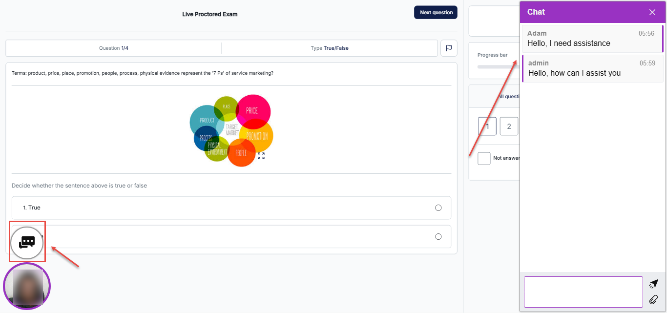 At any time, the student can contact the proctor via chat or voice. The proctor can respond through chat or a live connection using the microphone and camera.