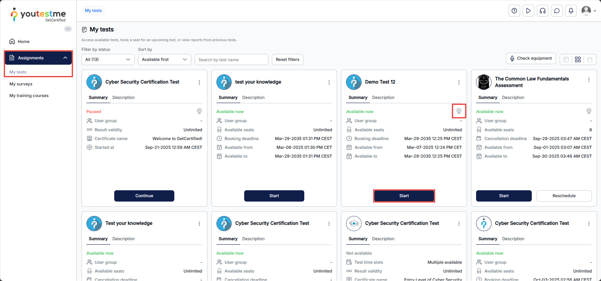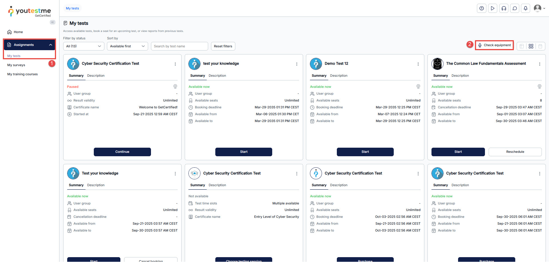 To ensure a smooth experience, candidates can run an equipment check before the actual test. This simulation follows the same check-in steps configured for the test, allowing candidates to confirm their setup and troubleshoot any issues in advance.