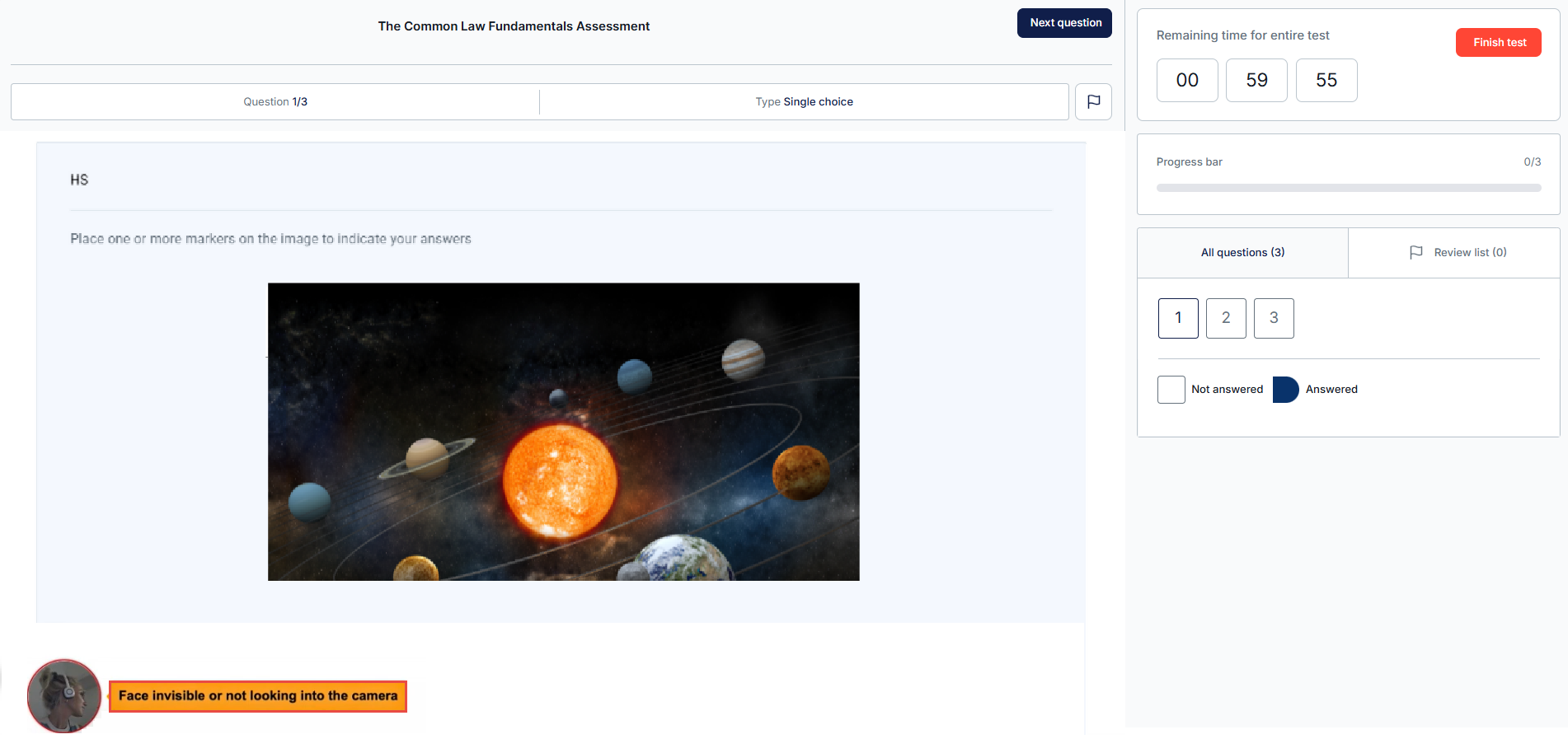 During the test, your screen and video will be recorded continuously. A video thumbnail will appear in the bottom-left corner of the screen to display your video feed. The system uses artificial intelligence to monitor the test process and will issue warnings if test rules are not followed. Please watch this walkthrough video to familiarize yourself with the process of taking a proctored test.