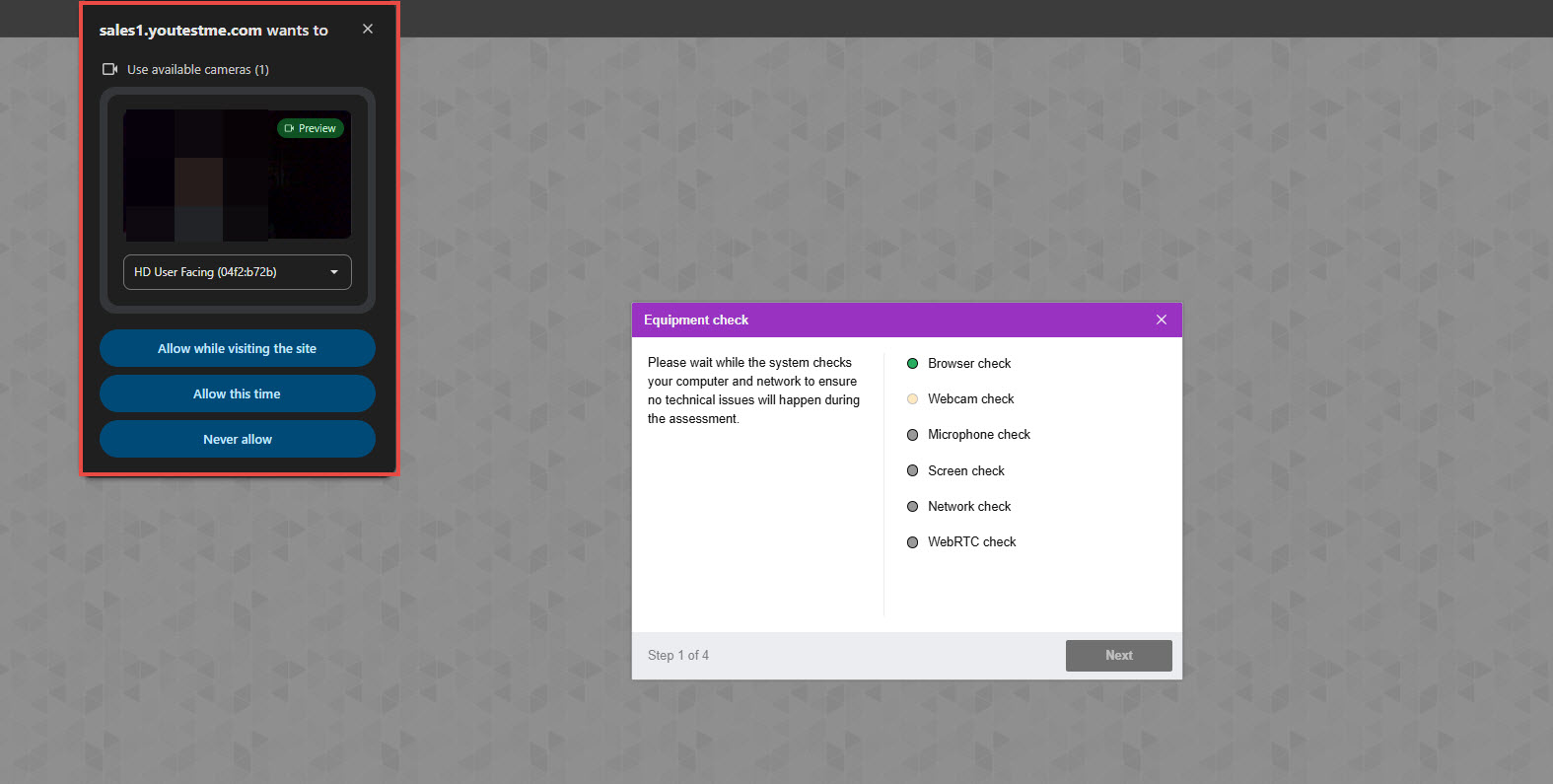 Taking a proctored test begins with a simple check-in process composed of steps defined by the test administration. This Equipment Check verifies everything needed for a secure and successful test. The system automatically assesses browser compatibility, internet stability, webcam and microphone functionality, screen-sharing capabilities, and the candidate’s identity. Depending on the test settings, candidates may also be asked to record their environment or connect a secondary camera.