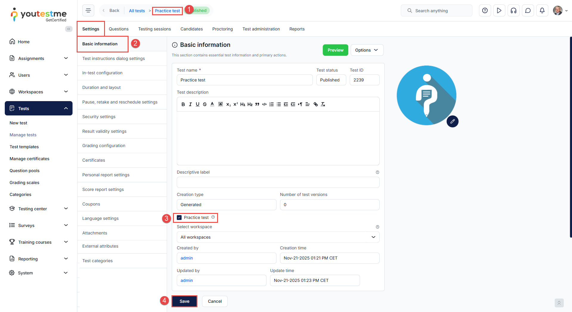 Any generated test can be turned into a practice test, even after it has been created or published. This gives test managers the flexibility to repurpose existing tests for preparation and self-study.