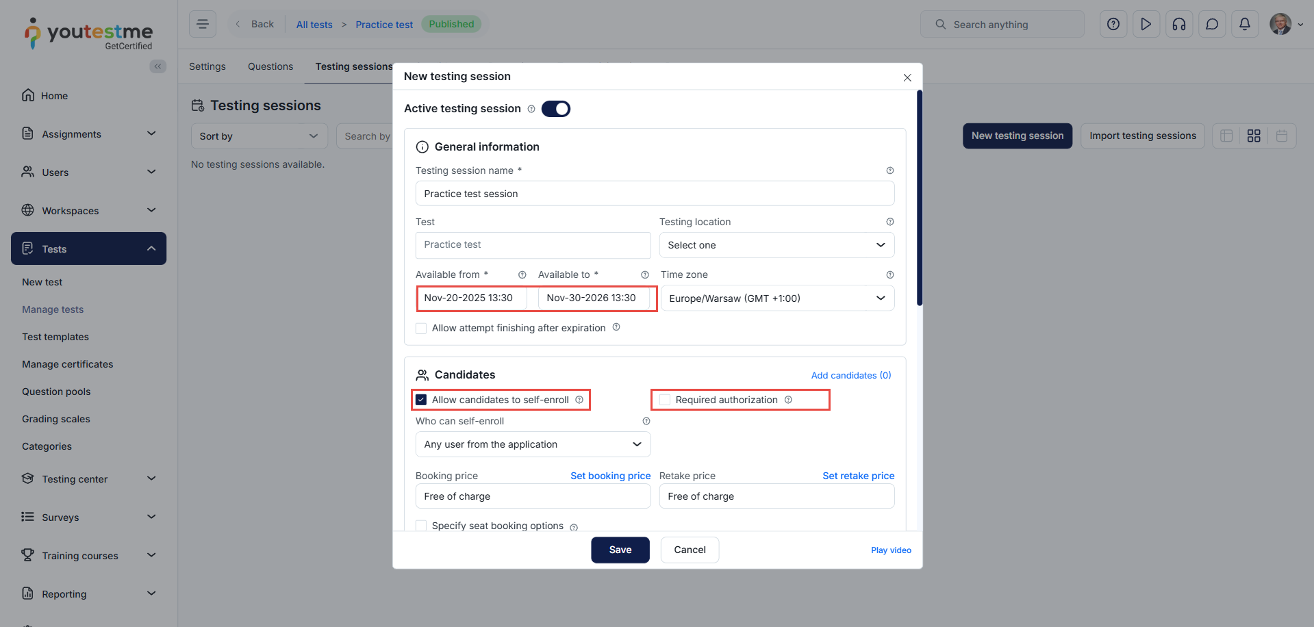 To allow candidates to take a practice test at any time—without being manually added to a session—the session must be configured as follows: