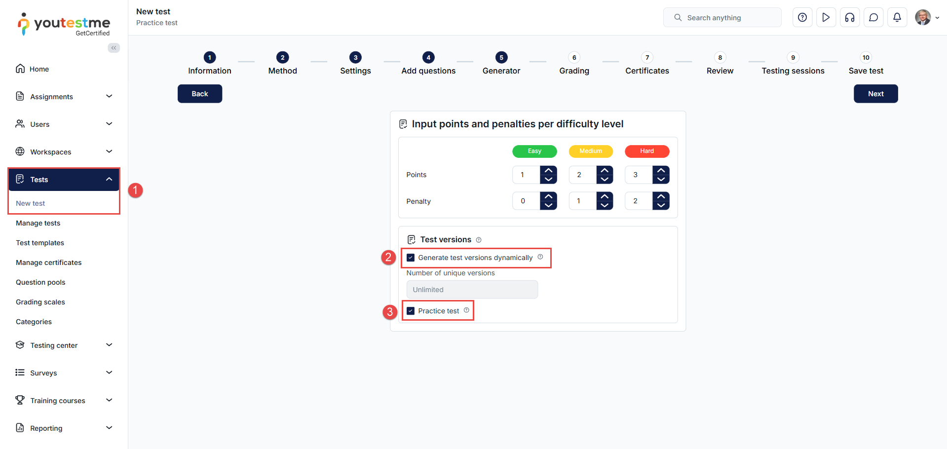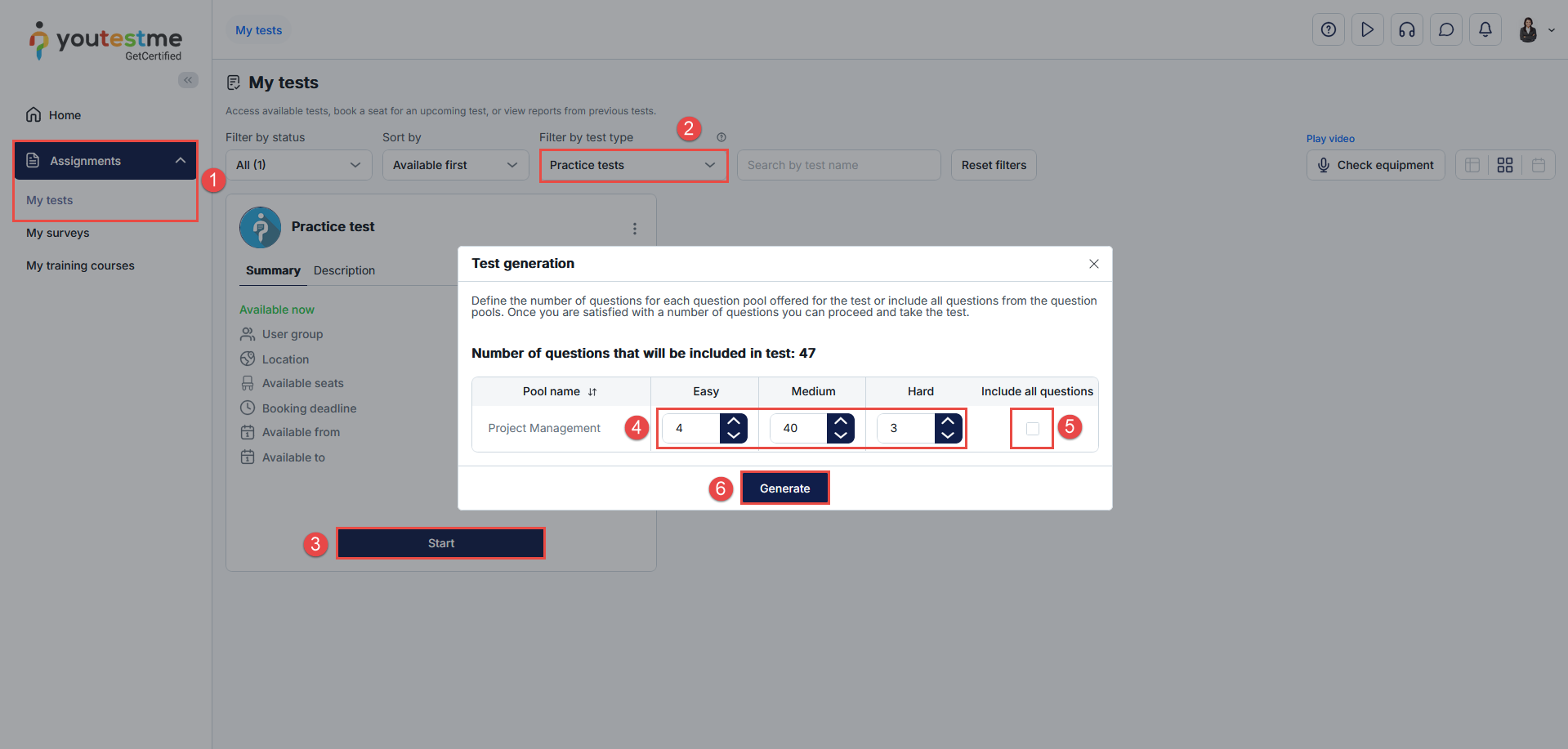 Once enabled, candidates will be able to generate their own practice versions using the test’s question pools.