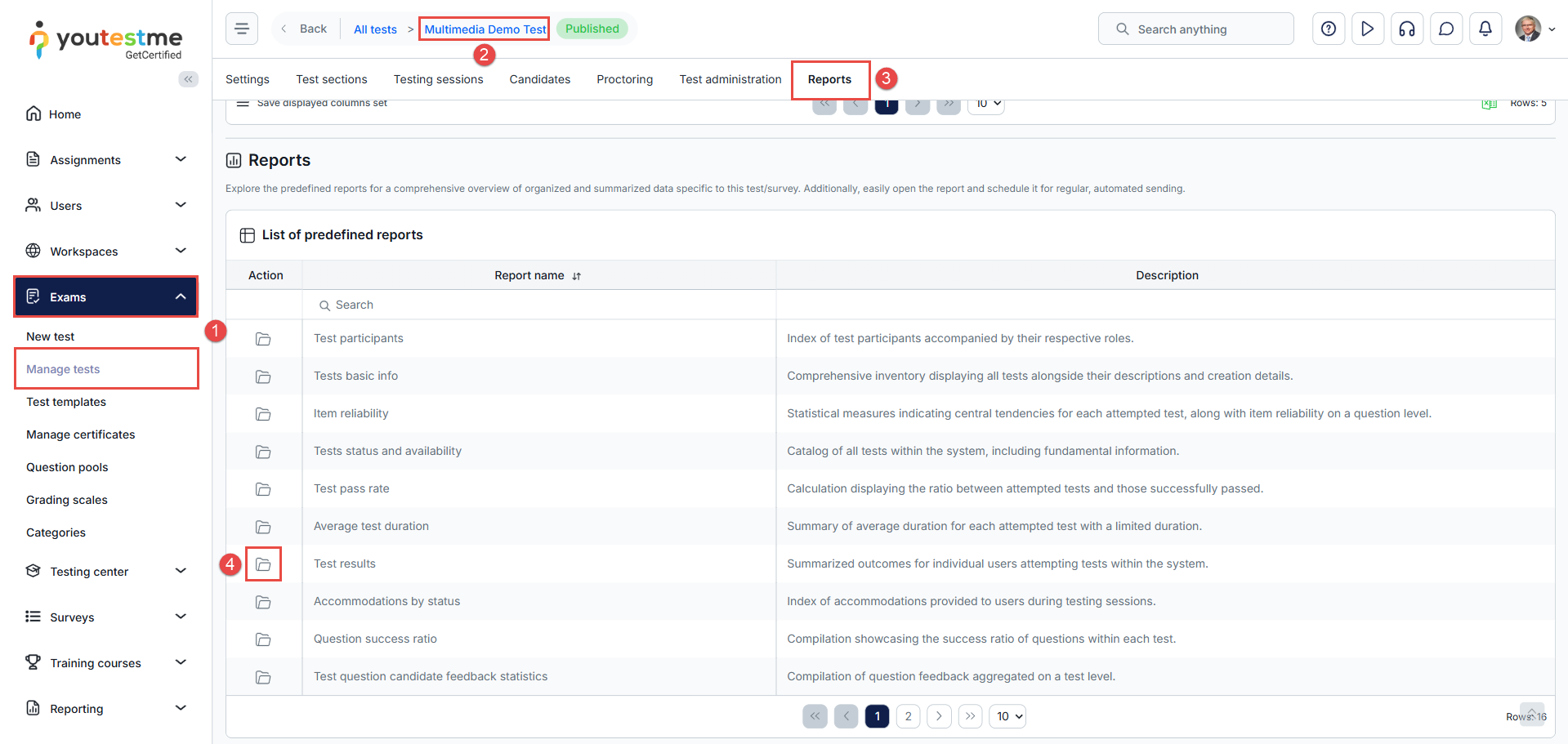 - Click on the Action column’s Open option to see the predefined report for the selected test.