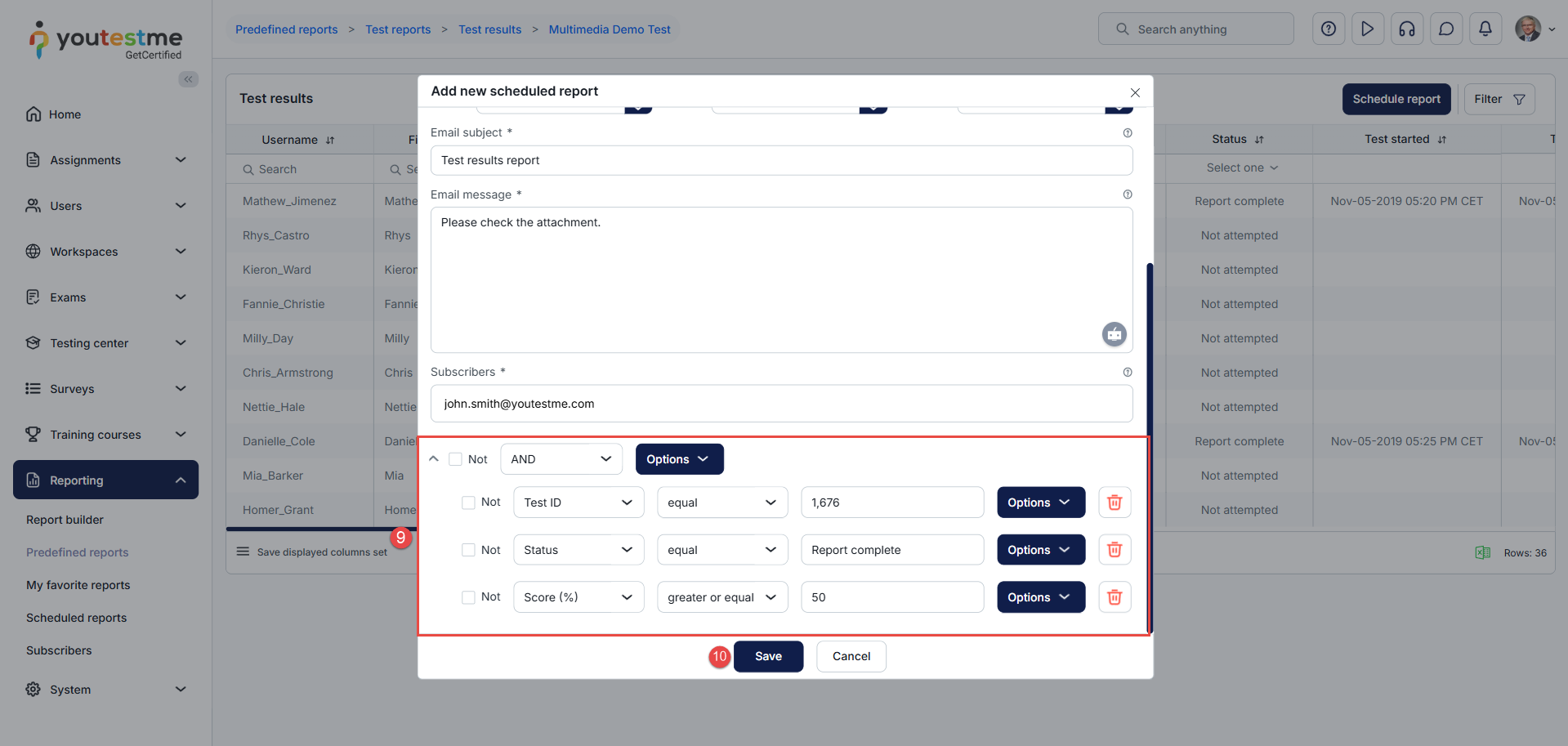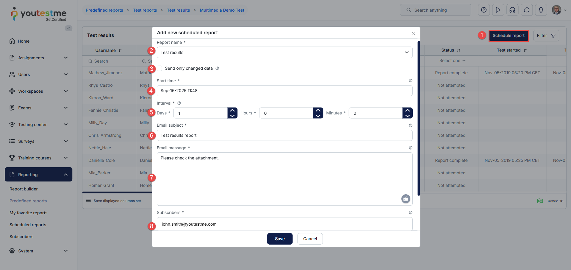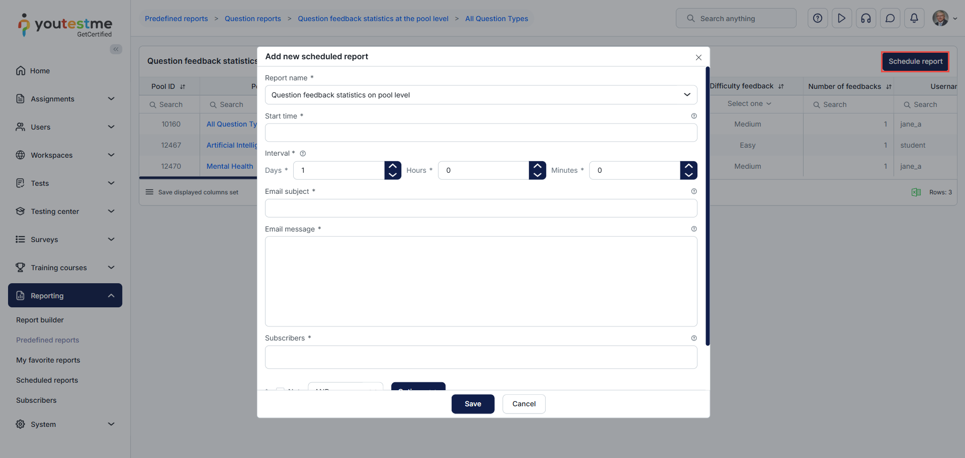 Note: Scheduled reports created for the tests and question pools can be found in the Reports/Scheduled reports tab and modified or deleted.