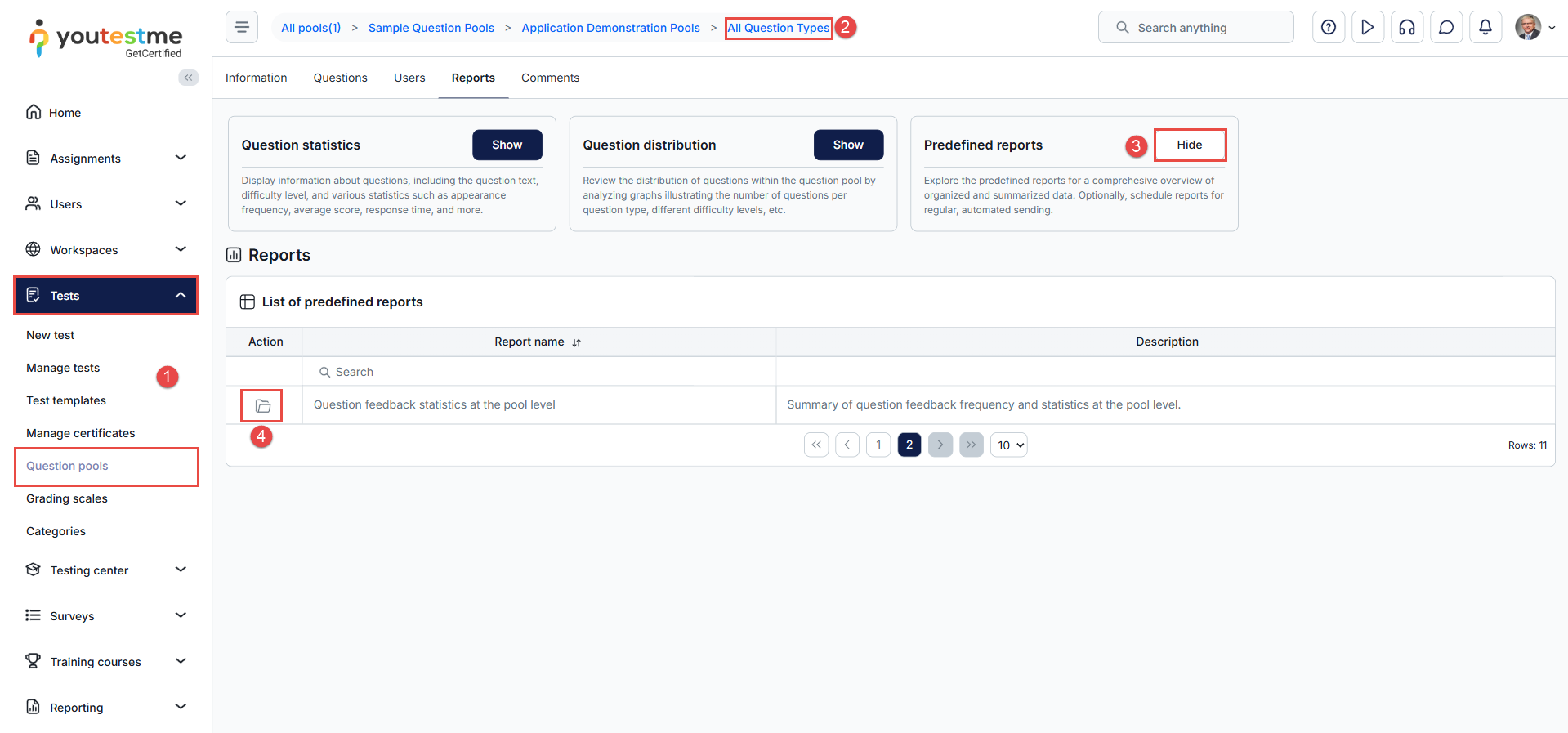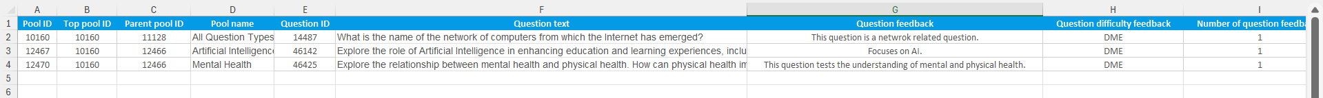 - Questions in the question pools that have feedback. This report contains the following information: pool ID, top pool ID, parent pool ID, pool name, question ID, question text, question feedback, question difficulty feedback, number of question feedbacks, user ID, username, email, first and last name, attempt start and end times, result, test finished, and question status.