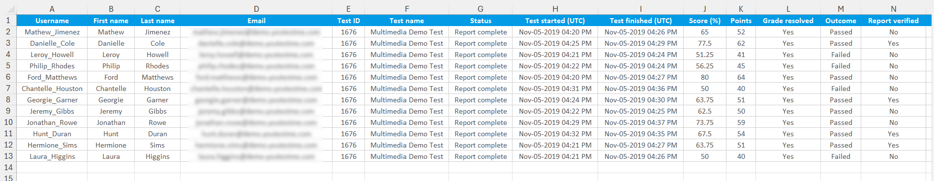 Downloading the Excel file, you will see which questions satisfy the conditions defined for the scheduled report. Also, you can see the following fields: username, first and last name, email, test ID, test name, status, start and end time, user’s score, points, grade resolved, outcome, report verified, visible to student, test version, version unique code, session, session enabled from and to, and test creation date.