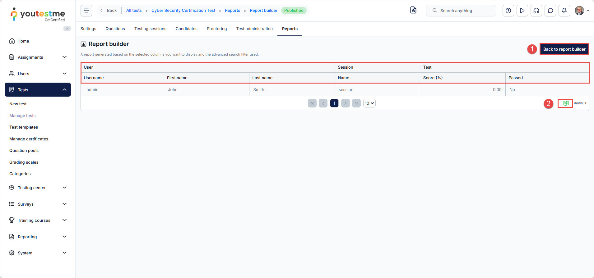 - To open a Report builder for a specific test, select the Tests/Manage tests tab.