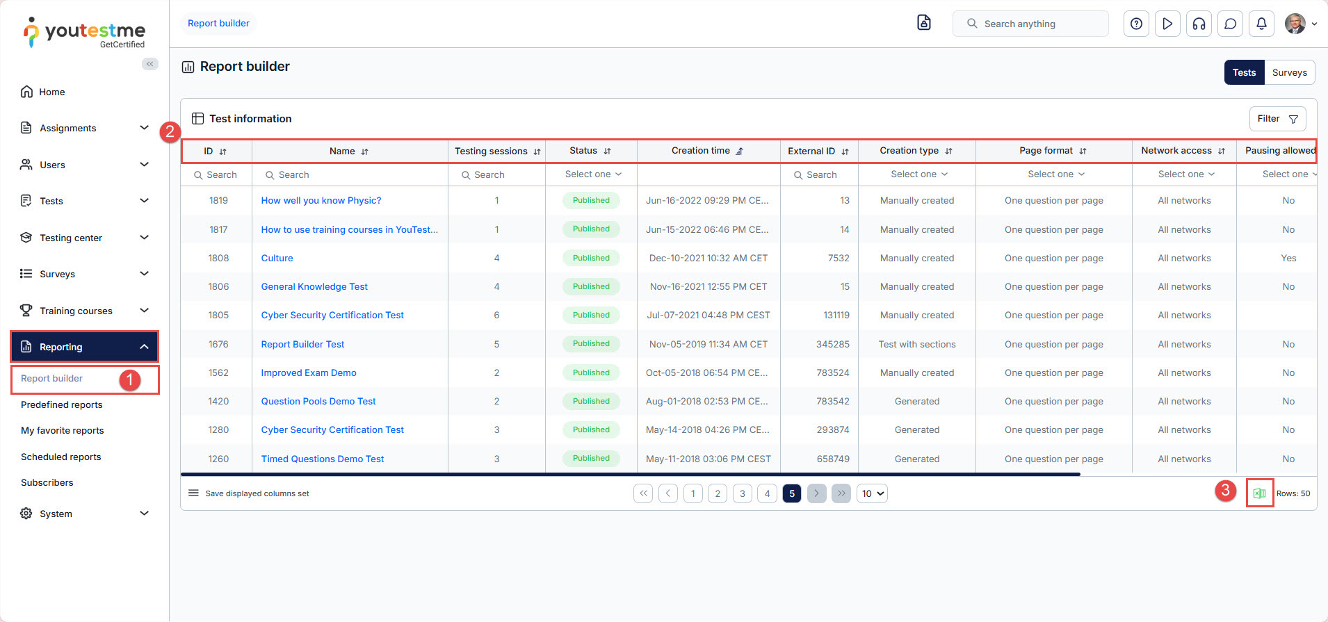 - The Displayed columns option allows you to show the available options for all tests for example:for example: ID, Name, Date of creation…).